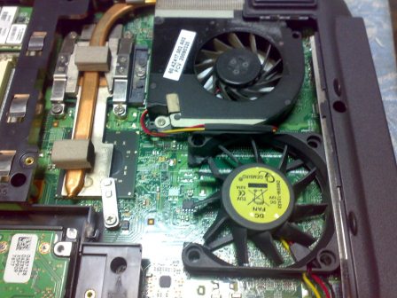 Видно, что на этой материнке не распаян разъём для видеокарты. Но если бы он и был, чипсет всё равно не выдаёт 16 линий PCI-E (это кстати позволяют делать старшие чипсеты, чипсеты идентичны по распиновке, но не писать же мне биос на этот ноут потом самому?) Следовательно у нас (меня точнее) есть куча свободного места. Еще необходимо было этот радиатор чем-то обдувать, для чего был куплен вентилятор типоразмера 60х60х10мм, и переделан в вентилятор турбинного типа методом удаления одной из боковых стенок. (но на этом дело не закончилось, воздушный поток мне показался слабым, пришлось нагревать промышленным феном лопасти до состояния пластичности и придавать им более прямую форму, чтобы они были перпендикулярны основанию вентилятора) Вот что получилось: