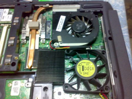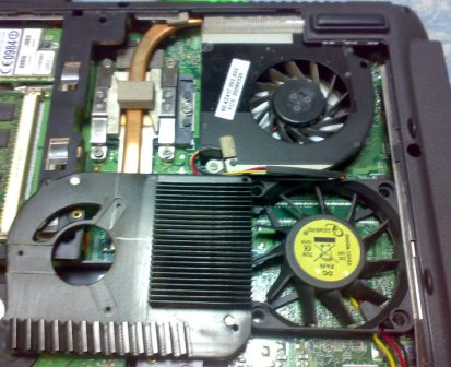 Разбираем радиатор, снимаем с него вентилятор (он был слишком высокий и скрипучий, да и крутился только от 12в), примеряем в свободное пространство ноута: