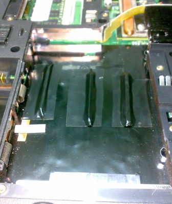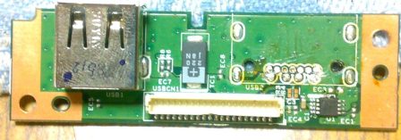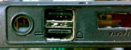 В процессе переделки охлаждения ноутбук был полностью разобран. В корпусе обнаружилась печатная плата с одним разъёмом USB, а рядом с ним место под второй USB, совмещенный с e-SATA, всё это было выведено на заднюю панель ноутбука, причём перед e-SATA/USB стояла просто пластиковая заглушка: