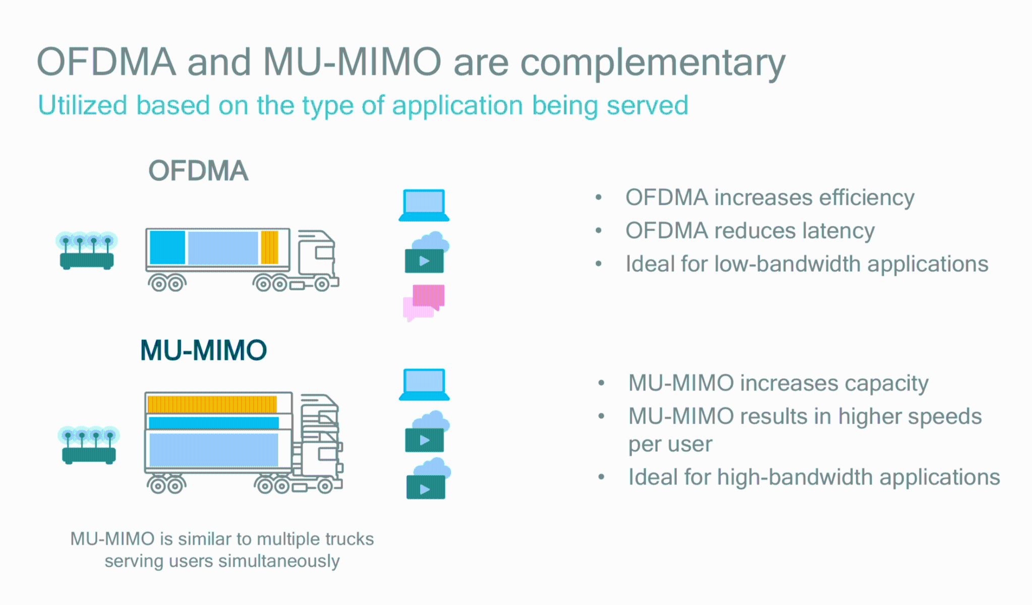 | SU/MU-MIMO-OFDM/A | SU-MIMO-OFDM | SU-MIMO-OFDM Wave 1, MU-MIMO-OFDM Wave 2 | MU-MIMO-OFDMA |