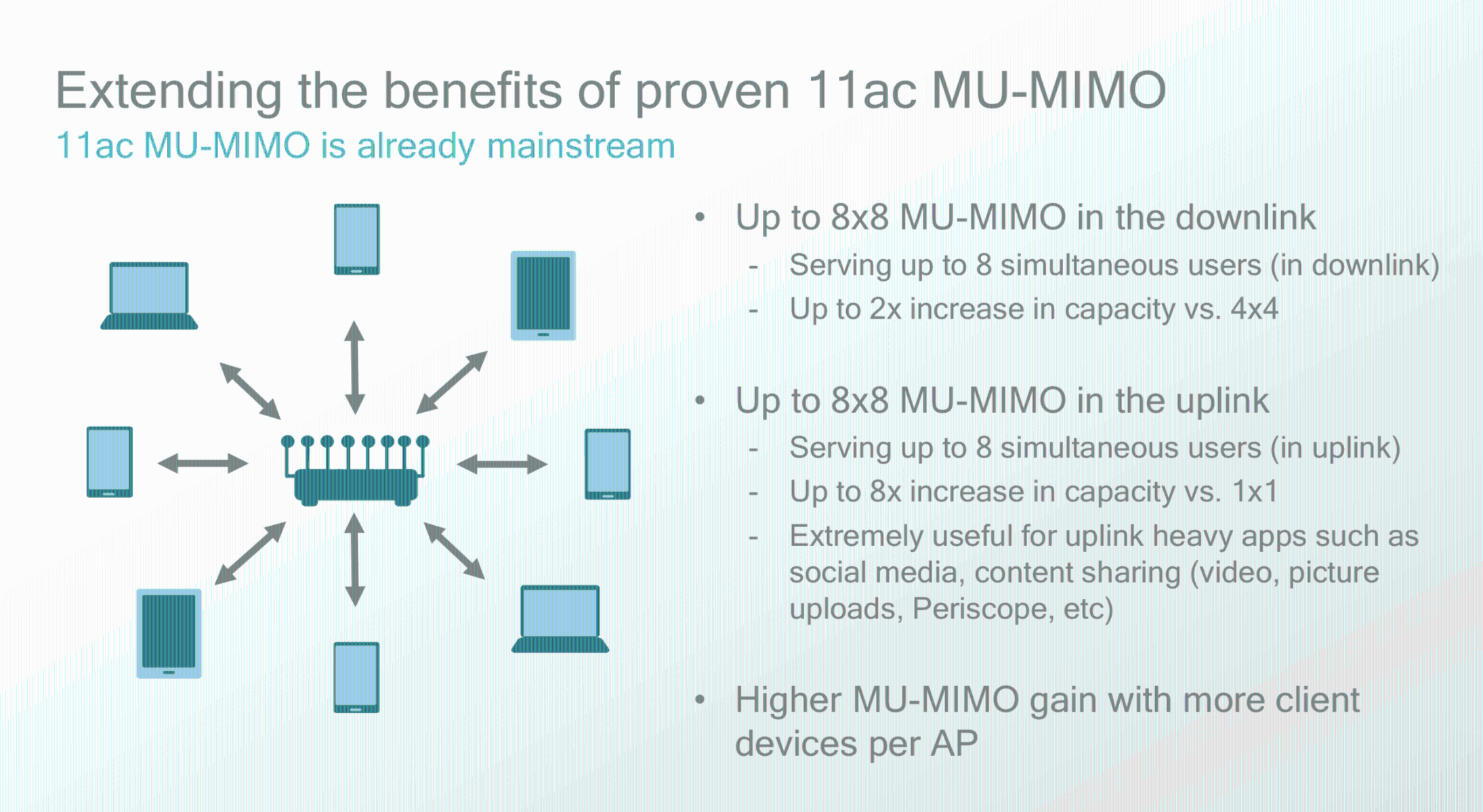 Многопользовательский MIMO (MU-MIMO) в стандарте 802.11ac Wave 2, позволяющий одновременно использовать четыре downlink соединения вместо одного в однопользовательском MIMO (по-прежнему 1x1 uplink линия связи)