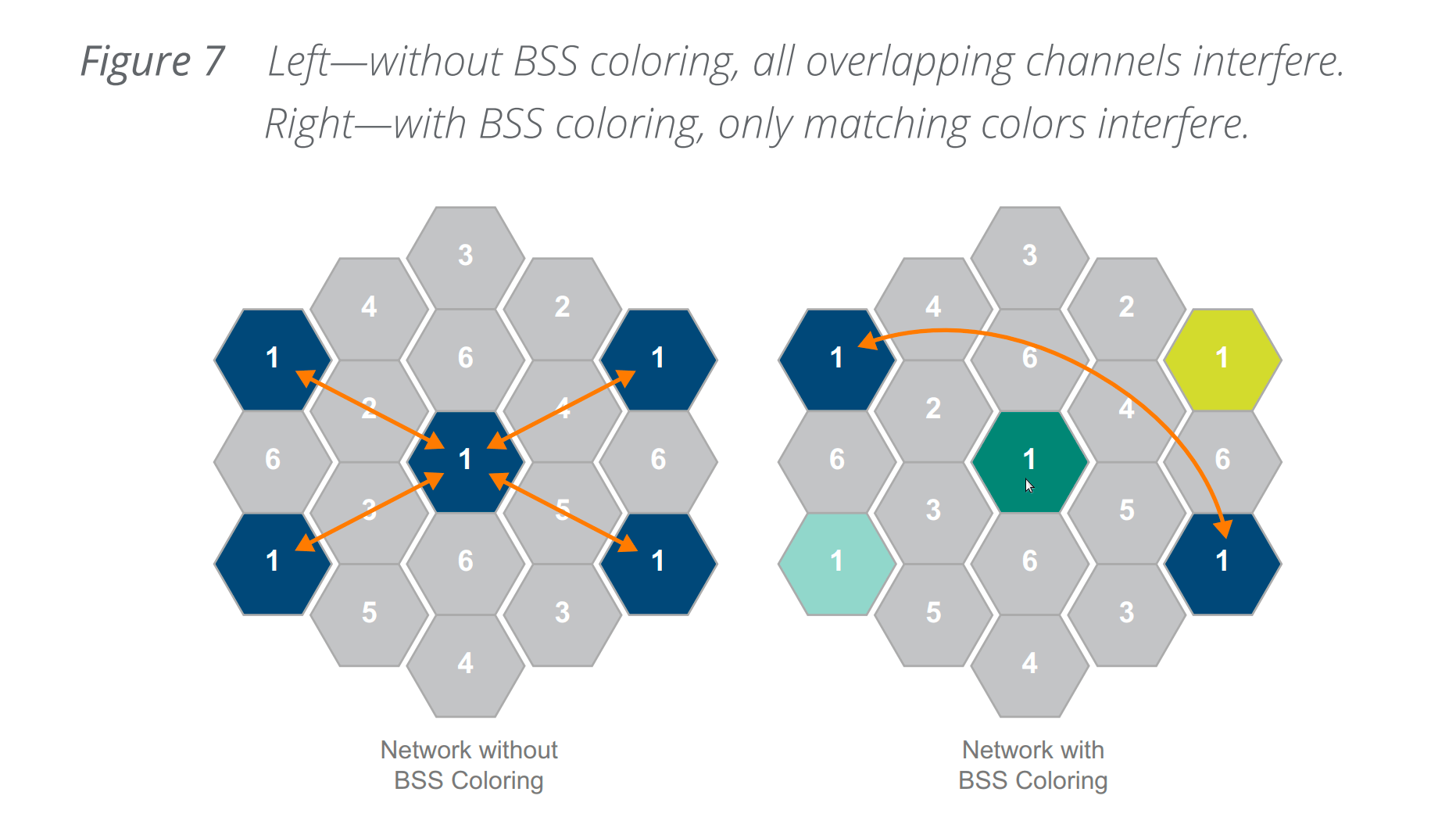 Spatial frequency reuse/OBSS (Окрашивание BSS) - если несколько точек доступа работают на одном и том же канале (ах), они могут передавать данные с уникальным «цветным» идентификатором, который позволяет им обмениваться данными по беспроводной среде в одно и то же время, без ожидания.