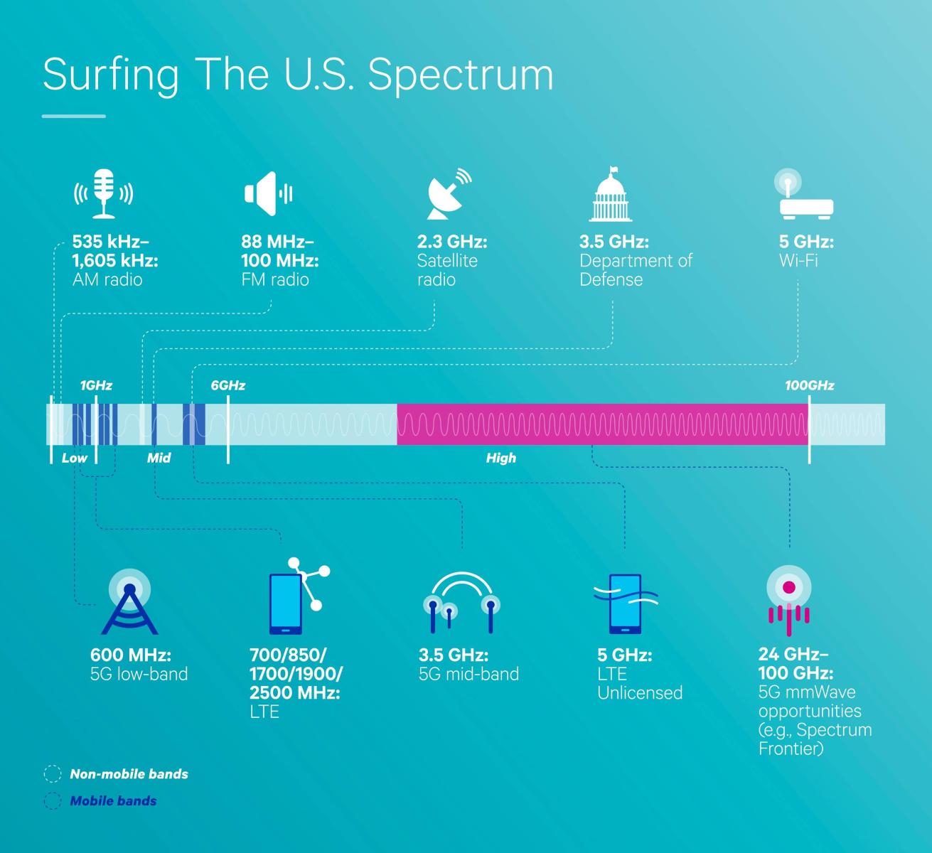 В июле 2017, заинтересованные компании призывали FCC публично прокомментировать тему по расширению спектра средней полосы частот от 3,7 ГГц до 24 ГГц. Более 30 технологических компаний, включая Qualcomm, представили предложение, в котором настаивали на том, что полоса 5925–7125 МГц («полоса 6 ГГц») является "необходимой для удовлетворения спроса на беспроводные широкополосные услуги следующего поколения".