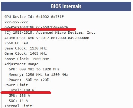 Gigabyte Radeon™ RX 5600 XT GAMING OC 6G - ограничение потребления в 180 Ватт, но ее можно спокойно повысить до 220 Ватт