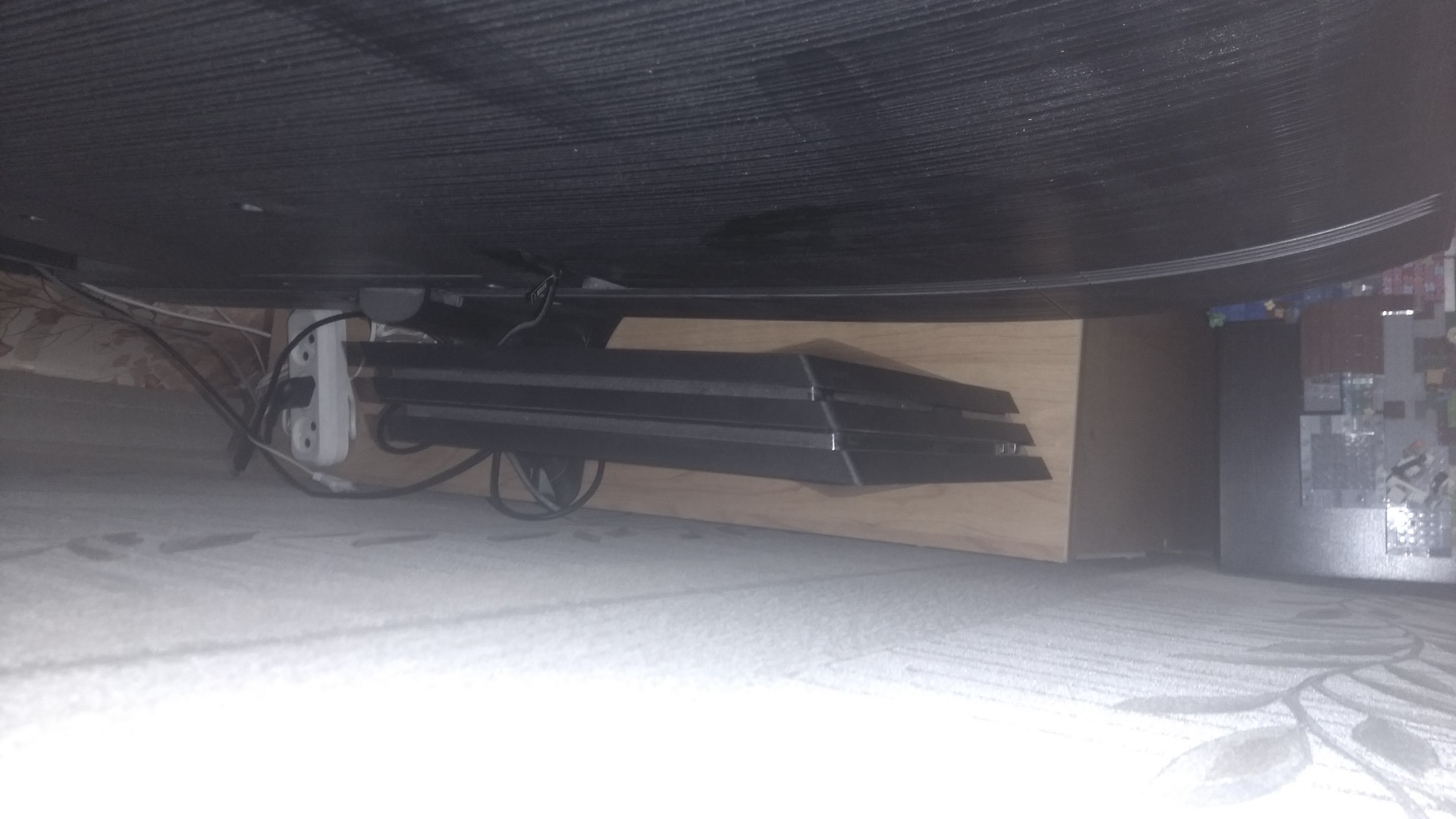 Это моя PS4 Pro, что прописалась миллион лет назад. Вокруг консоли масса места и приток холодного воздуха ни чем не ограничен. Устройство работает стабильно и не перегревается.
