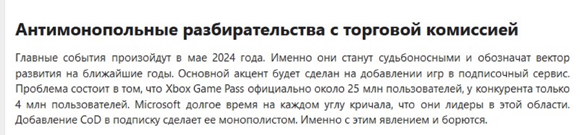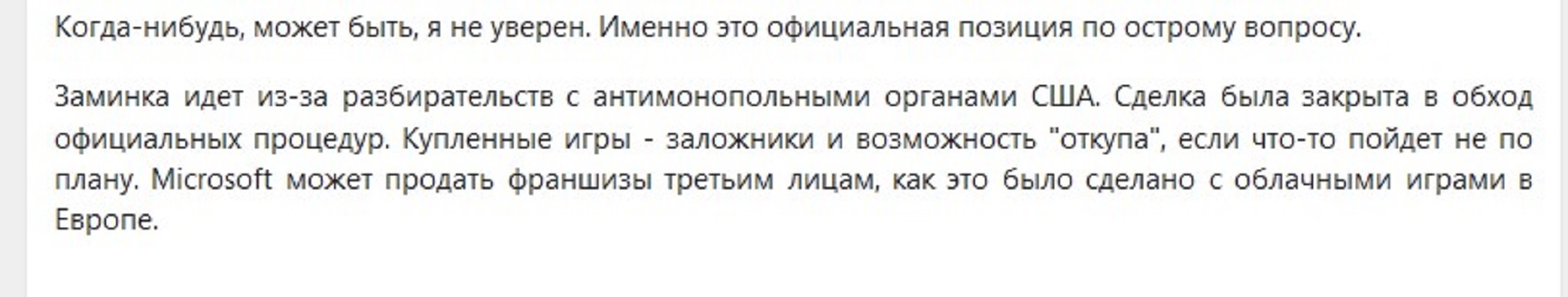 Игры стали разменной монетой для торга. Эксклюзивы и прочее - это карта, которую Фил Спенсер собирается разыграть, как это было в Великобритании с облачными играми. Это причина, по которой игры не попадут в подписку до мая 2024 года.