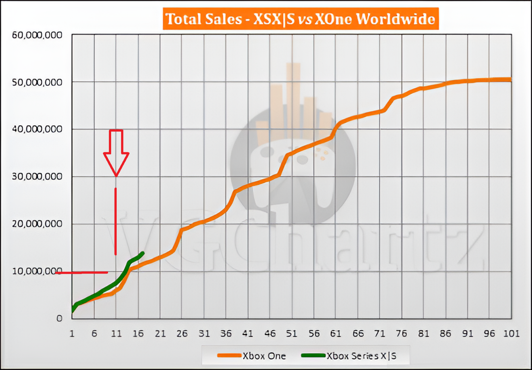 К данной новости прикладывается скриншот от аналитического агентства VGChartz, где можно было увидеть график с доминированием нового поколения над старым. Вы же верите уважаемому агентству? Согласно данному графику, продажи Xbox one в 11 месяце на уровне 5-6 млн проданных устройств. А это официальная цифра из официального источника.