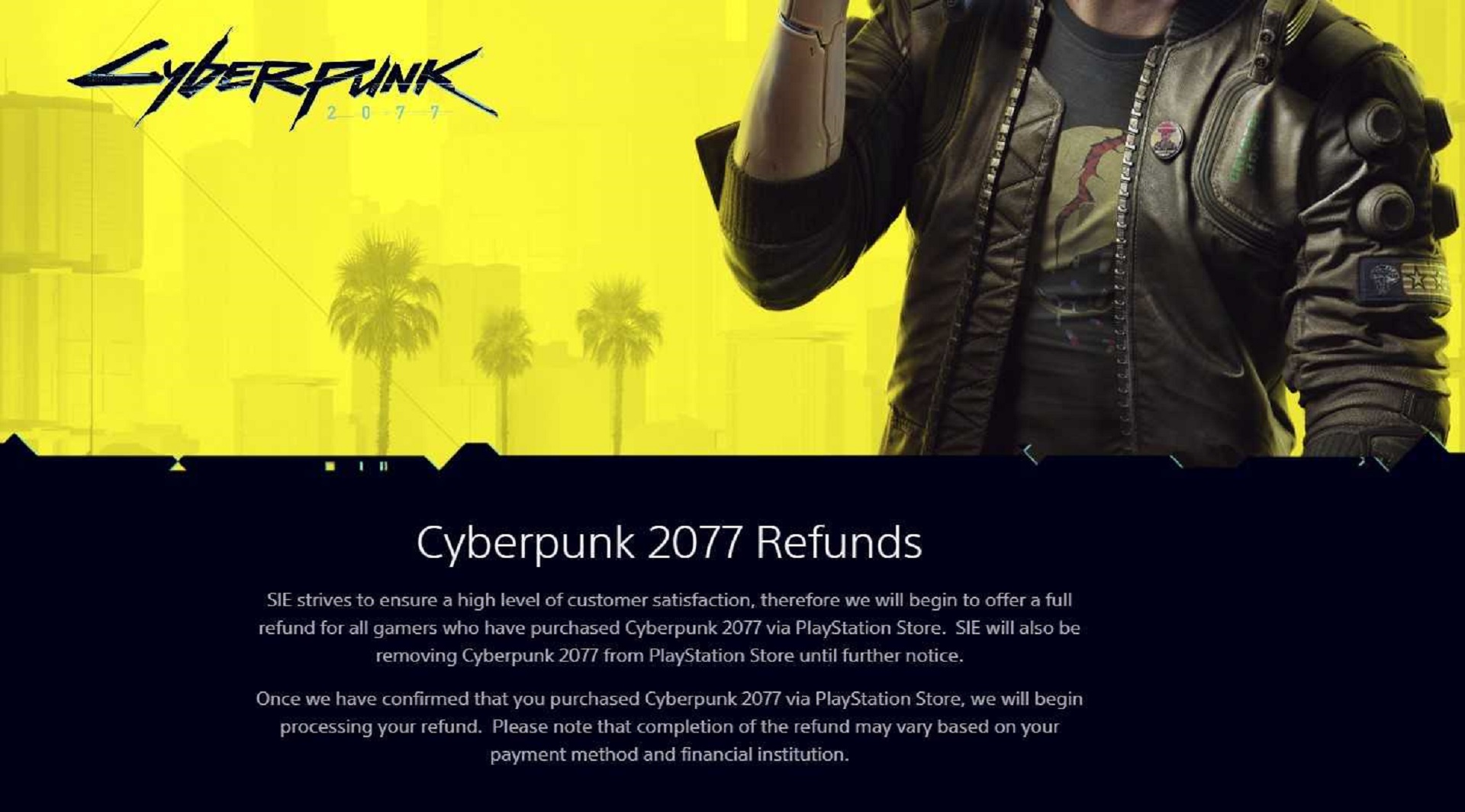 Через неделю после релиза поляки сделали официальное заявление и обещали вернуть деньги всем недовольным гражданам. Аналогичное заявление сделала PlayStation. Более того, она сняла игру с продажи. Тут стоит уточнить, что Cyberpunk 2077 была самой ожидаемой игрой 2020 года. За первые 10 дней было продано около 13 млн копий игры. Жирнейший кусочек по выручке. Платформодержатели (из расчета 30% и 60 тугриков за копию) за 10 дней заработали примерно 234 млн тугриков только на комиссии. На консоли, предположительно, пришлось около 50% всех продаж. Из-за ужасной оптимизации перед платформодержателями стоял вопрос: "Потерять деньги и снять некачественный товар с продажи, или заработать, наплевав на своих поклонников". Одни потеряли деньги, но некачественный товар был убран с полок магазинов, вторые продолжили продавать ущербный товар и воспользовались ажиотажем.