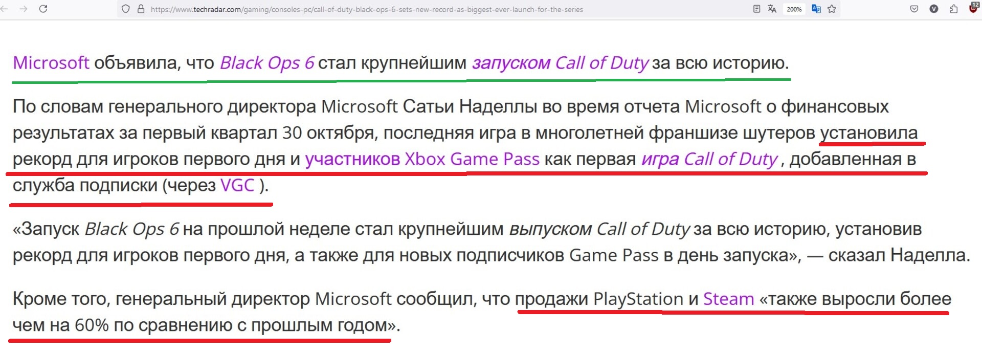 Мне не известны позиции сторон и что сейчас Microsoft обсуждает с Sony за закрытыми дверями. Если консольное подразделение отправится в Вальхаллу, то выручка от игры сократиться минимум на 20% по сравнению с политикой Бобби Котика. Microsoft Store не является конкурентом Steam и игры в нем имеют нулевую популярность. За счет каких преференций Xbox планирует окупать свои вложения на 38 лет? Сокращение персонала провели. Стоимость подписки повысили. Расходы на рекламу и продвижение сократили.