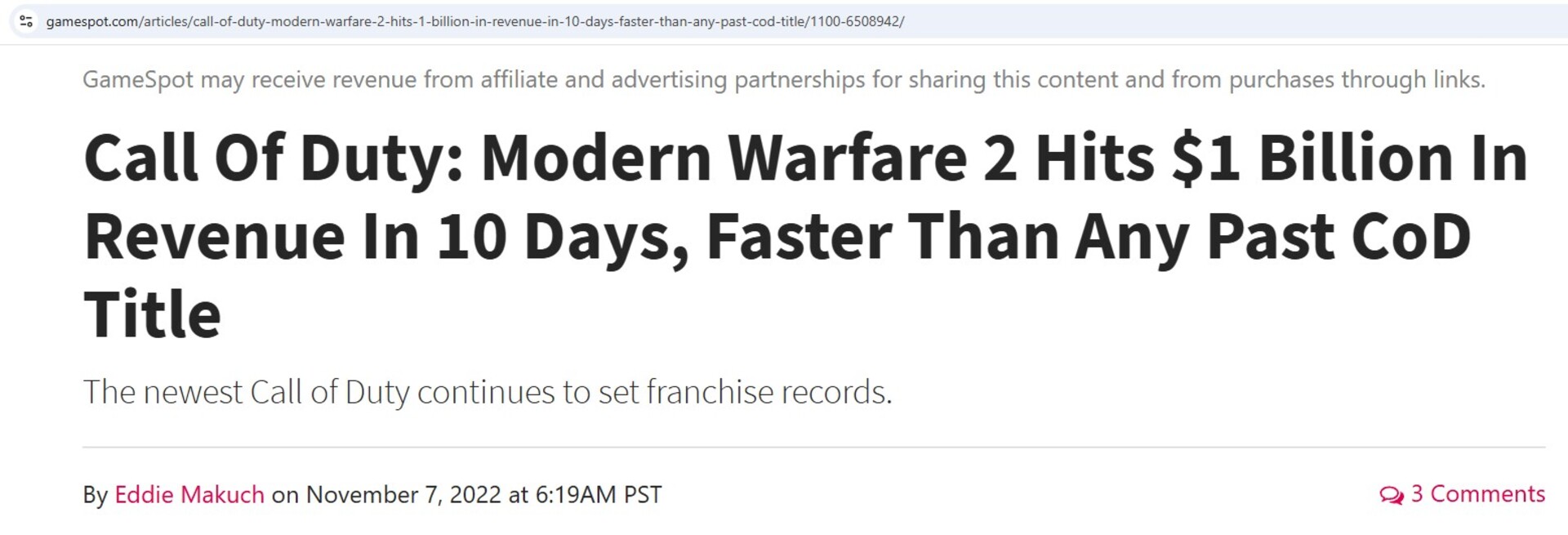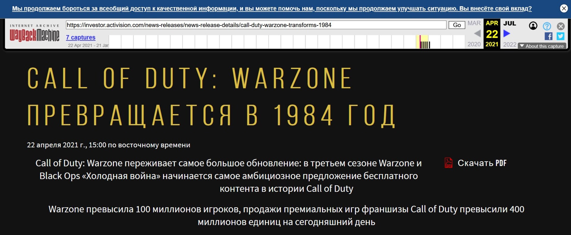 Публикация абсолютно случайно совпала с релизом новой игры и разлетелась по всем пабликам мира. Вы же тоже видели эту новость? То есть, происходит грандиозное событие, о котором мечтает любая корпорация, но так получается, что на официальном сайте о ней нет ни единого упоминания (на момент написания этих строк). Более того, в 2021 году на юбилейные 400 млн продаж Бобби Котик провел огромнейшее мероприятие, к которому готовились несколько месяцев. Упоминание события стерли из официальной истории, но интернет все помнит.