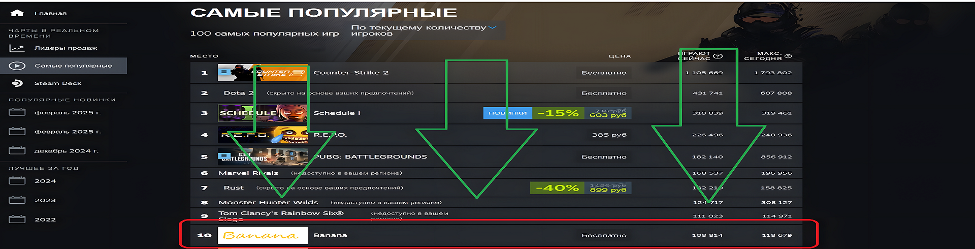 Летом 2024 года произошла настоящая феерия разложения Steam. Выходит игра Banana — уже полгода она находится в топе самых популярных игр.