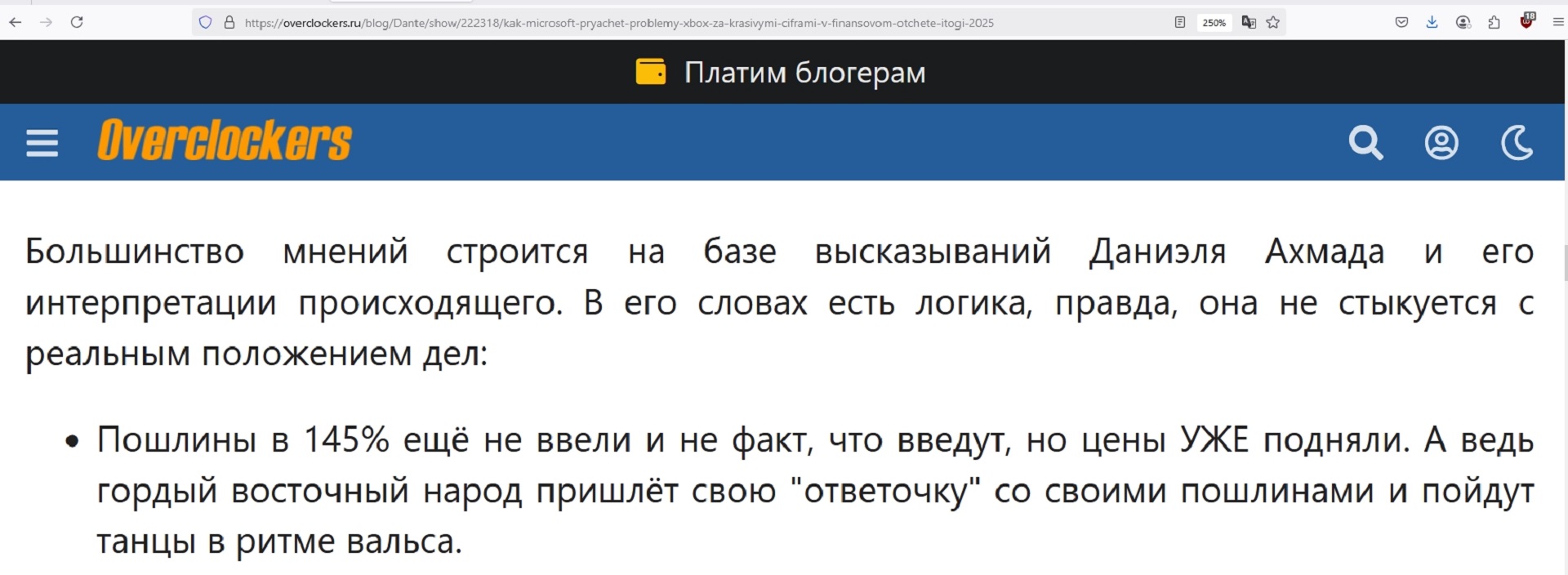 Не являюсь узким специалистом в этом вопросе, но базовых знаний было достаточно, чтобы понять, какую белиберду несёт человек, специализирующийся на анализе игрового рынка. Для понимания — что такое пошлина в 145% на ввозимые товары. Американцы готовы выходить на забастовки из-за изменения зарплаты на 25%.