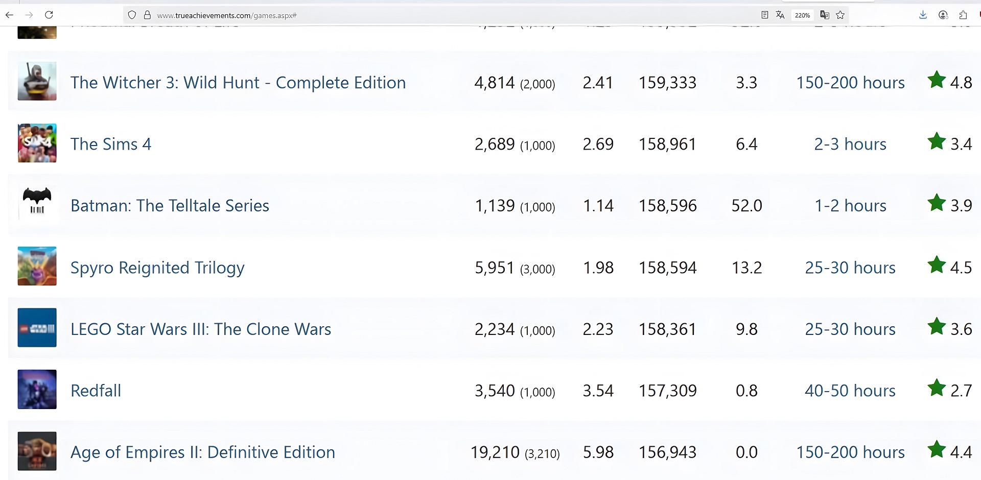 Это таблица поигравших на консолях Xbox с сайта trueachievements и получивших награды в играх. Цифры не абсолютные, но с правильным соотношением. По ним можно оценить популярность той или иной игры. В провальный Redfall поиграло примерно столько же людей, что и в легендарную The Witcher 3. Одна поддерживается десять лет, имеет массу поклонников, постоянно в новостях. О второй забыли через пару недель. Это про влияние подписки и ее "положительном" влиянии на рынок.