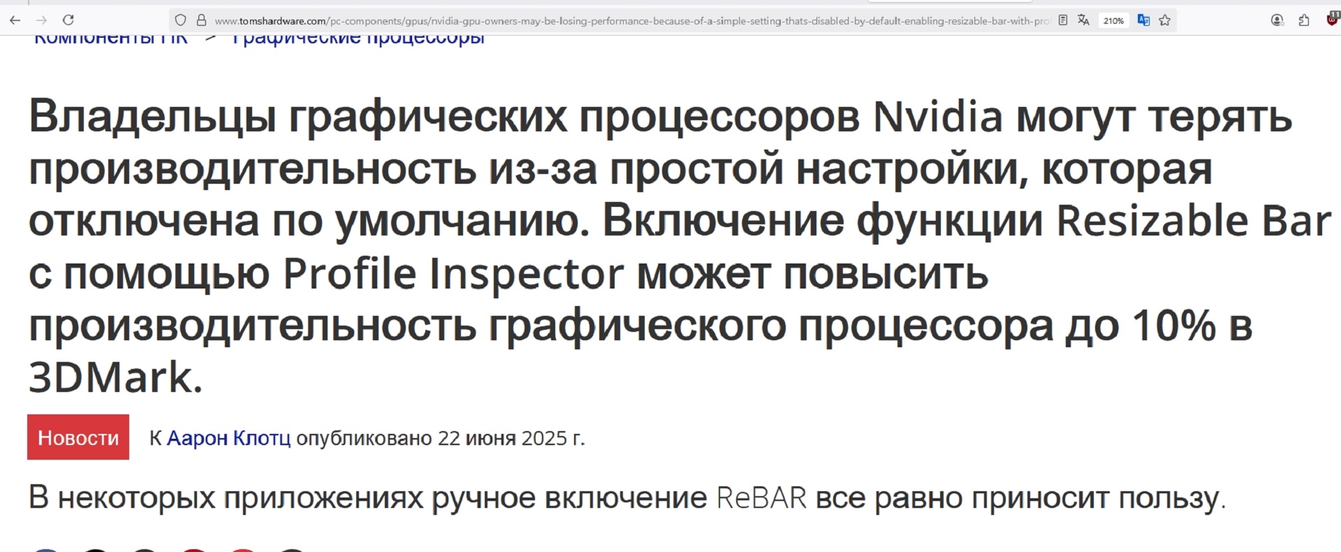 Ответ: есть эпически высокая вероятность, что у любителя жареной картошечки не работает технология Resizable BAR. Это настройка в BIOS, так же отключенная по умолчанию, как и Secure Boot. При определённых обстоятельствах в некоторых проектах у него потери производительности могут достигать 20%. НО! Он предлагает потратить дополнительно $100–150 на видеокарты с 16 ГБ, чтобы при определённом положении луны на небосводе подобные потери не возникали.