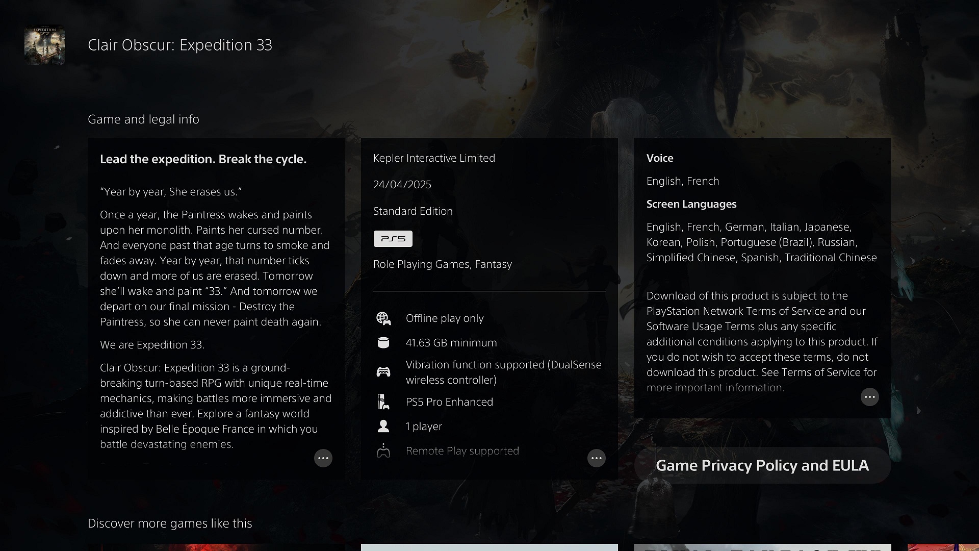 Карточка игры — это рекламный буклет. Его заполнением занимается издатель, а не платформодержатель. Что издатель посчитает важным, то он и указывает. На примере Clair Obscur: Expedition 33 привожу скриншоты карточки игры на консоли PS5.