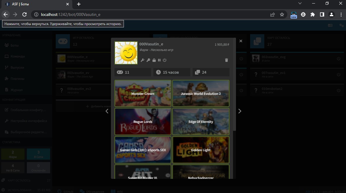 Для запуска 1000 ботов необходим системный блок с 4 Гб оперативной памяти и четырёхъядерный процессор. Для запуска 8 000 ботов, умножайте цифры на 8. Есть некоторые ограничения, с подключением с одного IP адреса, но и этот вопрос легко обходится. Для бесплатных игр в Stean накрутить онлайн не составляет труда.
