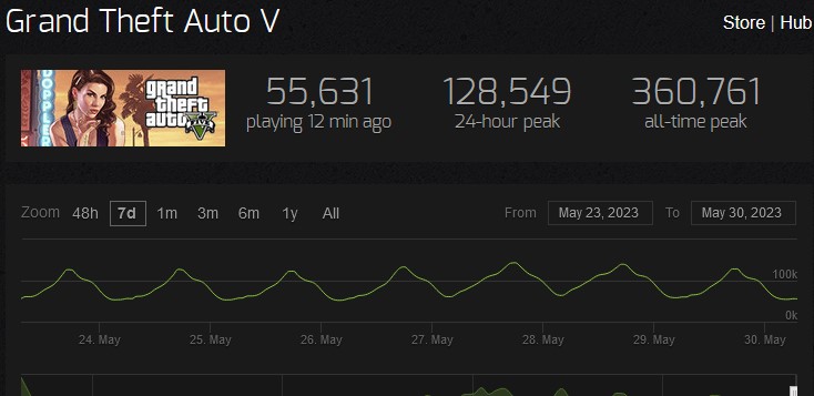 В полночь внезапно появляется резкий пик, что отчетливо видно на графике. В статистике с опозданием в 2 часа появляются 20 тысяч "новых игроков". В обычные дни, в это время, онлайн начинает падать, так как люди ложатся спать, но тут, внезапно, происходит чудо... Может это сбой? Выше приведен график GTA V за тот же период и сбоя в нем нет. В статистике других игр сбоя также нет. Но тут интересен график в следующие дни.