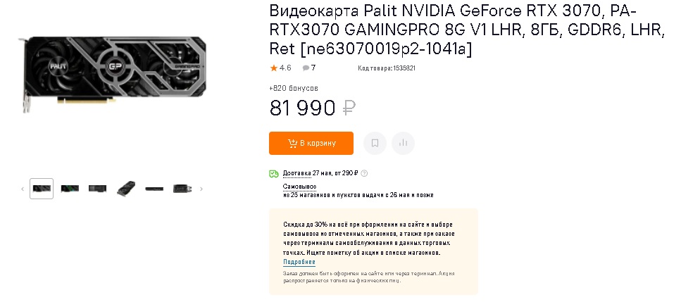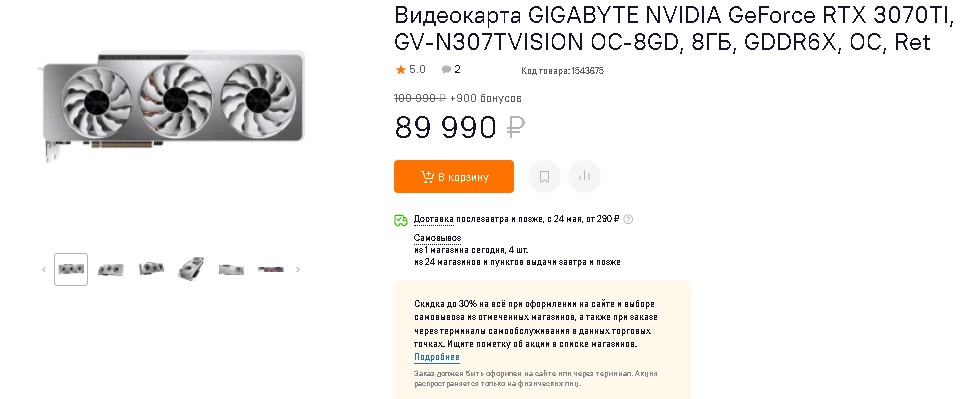 В совокупности с этим, российские ритейлеры продолжают опускать цены на комплектующие, к примеру: видеокарта NVIDIA GeForce RTX 3070 уже обходится в 81,990