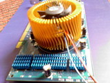 Тут я вспомнил, что когда только взял данную видеокарту я готовил и даже устанавливал на память радиаторы из распиленного кулера Maxtron для Socket A. Вот и пришла очередь им снова вернуться в работу. Крепились они с помощью двух скоб, выгнутых из старой большой канцелярской скрепки. Крепление получилось довольно упругое и радиаторы плотно прилегали к памяти. В качестве термоинтерфейса использовал КПТ-8.