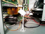 Установив карту на место, возникла следующая проблема: с новыми радиаторами на памяти и кулером на GPU карта стала весть около 600 грамм и ее свободный край довольно сильно провис.