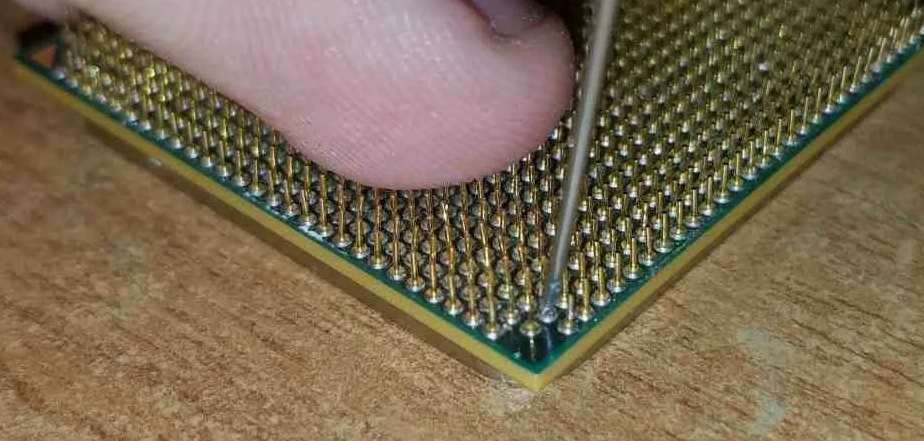 Погнутые ножки (актуально для процессоров AMD до AM4 сокета включительно) можно аккуратно выпрямить пинцетом или иглой для шприца. Рекомендую использовать именно иглу для шприца. Ее нужно предварительно подготовить - обрезать кончик, так чтобы отверстие не замялось. Для этого либо стачиваем острый конец на наждаке, либо срезаем отрезным кругом при помощи Дремеля. Ножка процессора должна свободно входить в отверстие иглы, но не болтаться там. Стараемся выправить ее за один раз, каждый лишний перегиб может привести к поломке пина. Если все же сломали, или пин уже был оторван, придется запаивать на это место новый. Однако не спешите сразу паять, изучите даташит процессора и за что отвечают оторванные ноги.