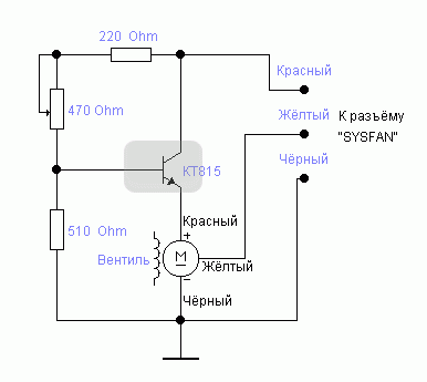 выставляется сопротивление переменного резака на максимум (верхнее по схеме положение движка) и схема подключается к компу (подключения\отключения можно производить не вырубая комп - что называеся - online). Вентиль должен завестись и вращаться примерно на 1700 rpm. Если же он не завёлся, надо уменьшить сопротивление резака на 220 ом (конечно же отрубив схему от компа!) до такого значения, пока вентиль при подключении схемы не будет стабильно заводиться. Возможно придётся изменить значение резака на 510 ом. Короче, экспериментируйте. Всё зависит от вашего конкретного вентиля.