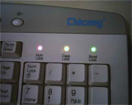 Выдрал 3 светодиода из старого корпуса 286-й IBM-ки и запаял в клаву вместо стандартных зелёных.