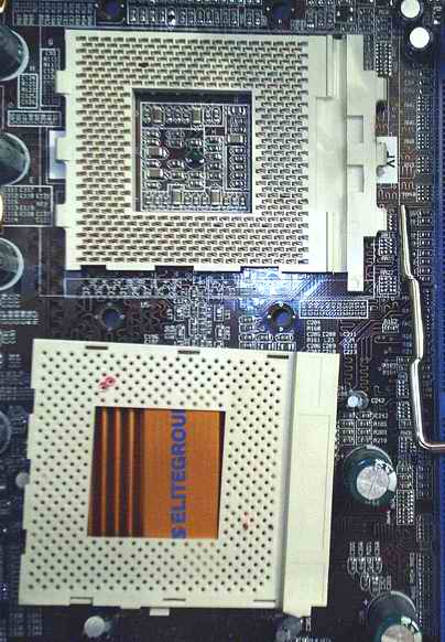 Так вот, решил я поснимать всякие "самопальные штучки на проводах". Но множитель то проца должен остаться 15х, чтобы остался разгон. И напруга должна быть не меньше 1,65В (по умолчанию на 1700-ом мать выставляла 1,60В, чего недостаточно). Насчёт множителя - вот тут http://www.overclockers.ru/news/newsitem.shtml?category=2&id=1050266349 толково написано, как сделать "Любой множитель, через ножки процессора!" с помощью проволочек в сокет. Вот я снял кулер, проц, а в сокете остались 2 изолятора (кембрика), которые нужны были для уменьшения напряжения на проце, когда он работал на 1800 МГц. Как ни пытался их выковырять с помощь иголки и такой-то матери - не смог