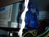 В общем закрыл не солоно хлебавши. Но оставаться без подарка я не собирался и решил приклеить (!!!) вентиль к задней стенки БП. Посмотрел сквозь дырки на внутренности БП, приложил вентиль и понял, его вполне хватит, чтобы обдувать оба радиатора внутри БП. Приклеивал клеем “Момент”. Сначала намазал вентиль клеем по периметру, как положено подождал пару минут и прижал, что есть мочи к БП. Вот что получилось: