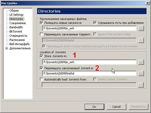 А установив в настройках uTorrent папки [1] и [2], как на картинке, все .torrent файлы, находящиеся в процессе закачки, хранятся в папке [1], а уже скачанные - в папке [2]: