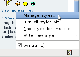 После установки и перезагрузки браузера в правом нижнем углу появится иконка стайлиша. Кликаем по ней правой кнопкой и выбираем управление стилями: