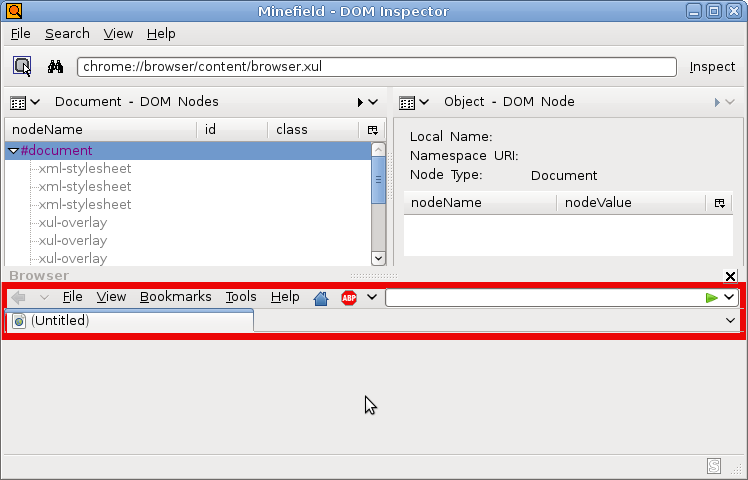 В инспекторе в строку адреса вводим: chrome://browser/content/browser.xul и кликаем кнопочку Inspect в правом верхнем углу.