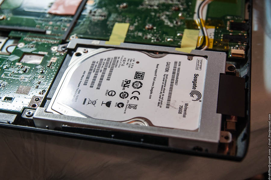 Отщёлкиваем миллион защёлок, и вот материнская плата. В правом нижнем углу прячется как раз заменяемый винчестер на 750 Гб.