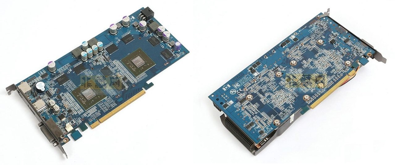GTX 460 Dual. Прототип двухчиповой GeForce GTX 460 производства Zotaс был запечатлен сотрудниками сайта Expreview осенью 2010 года. Видеокарта имела в своей основе пару видеочипов GF104, каждый видеочип располагал 1024 Мб видеопамяти стандарта GDDR5 и сообщался с ней посредством 256 битной шины. Помимо пары GPU, чипов памяти и разъема MIO, на печатной плате была распаяна специальная микросхема NVIDIA nForce 200, которая отвечала за распределение линий PCI-E между видеочипами. Дополнительное питание подавалось посредством пары 8-pin PCI-E разъемов. За вывод изображения отвечал квартет разъемов DVI. Частоты видеокарты так и остались неизвестными, так как в серийное производство она не пошла. Ссылка на оригинальную новость.