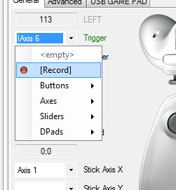 Вначале настраиваем все кнопки и оси, для этого из списка рядом с названием кнопок выбираем Record, на изображении геймпада в окне программы подсветится кнопка, нажимаем соответствующую кнопку на своем геймпаде - так поступаем со всеми значениями.