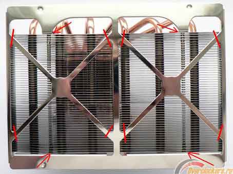 Планка жесткости крепится к радиатору при помощи 4 саморезов, о расположении которых можно судить по стрелкам на рисунке.