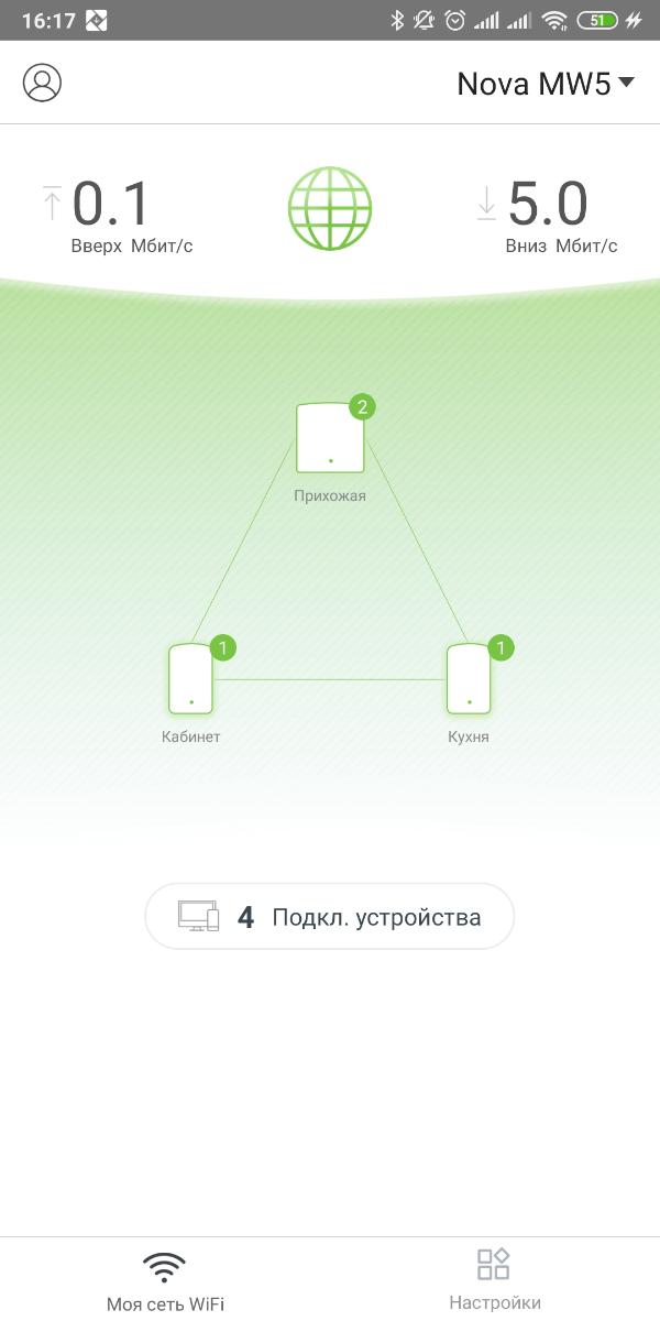 Главный экран отображает состояние блоков и общую скорость передачи данных. Русификация тут не самая удачная, но понятная. При нажатии на каждую из нод можно вывести дополнительную информацию о ней, оценить качество связи, назначить расположение и настроить работу индикаторов.