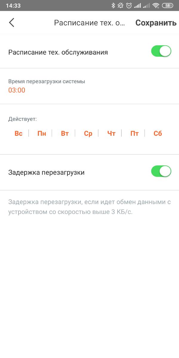А вот расписание тех. обслуживания назначает перезагрузку MW5 на заданное время при отсутствии трафика в заданное время. Зачем это нужно? Читал, что у некоторых отваливалась одна из нод, и помогала только перезагрузка. Во избежание подобной проблемы я оставил эту функцию активной. Отмечу, что за время работы в квартире проблем с отключениями не возникало.