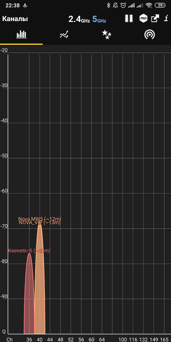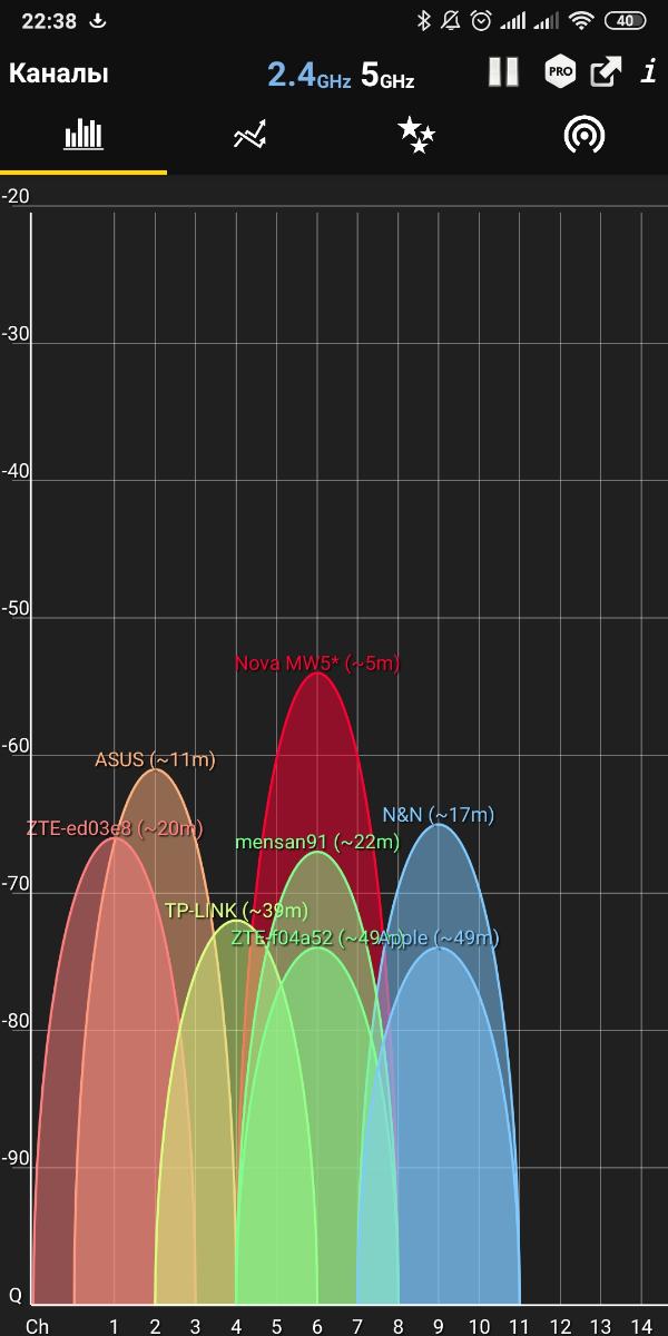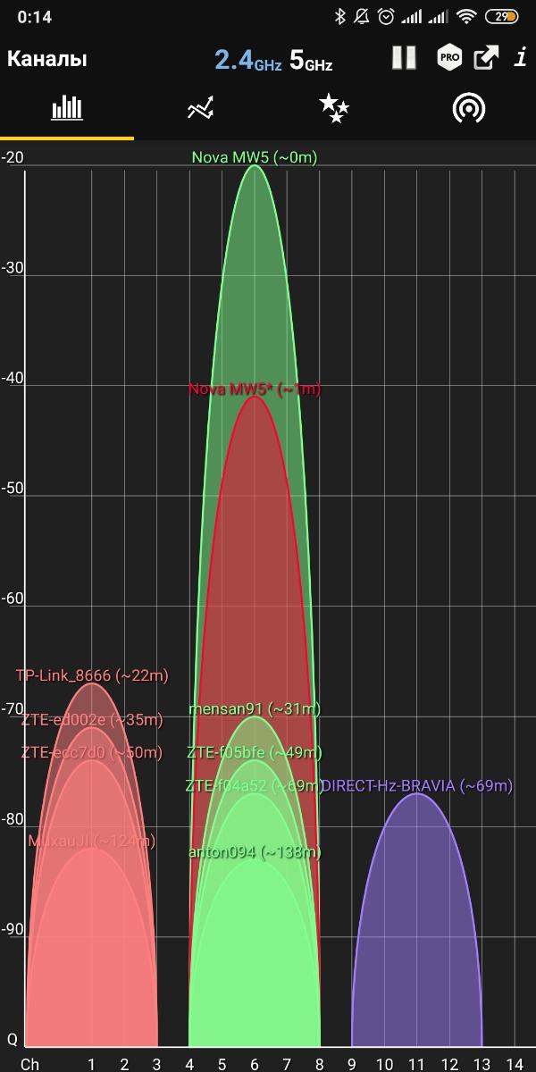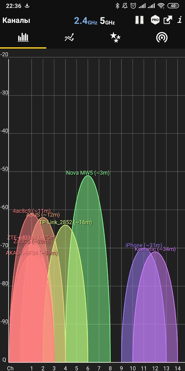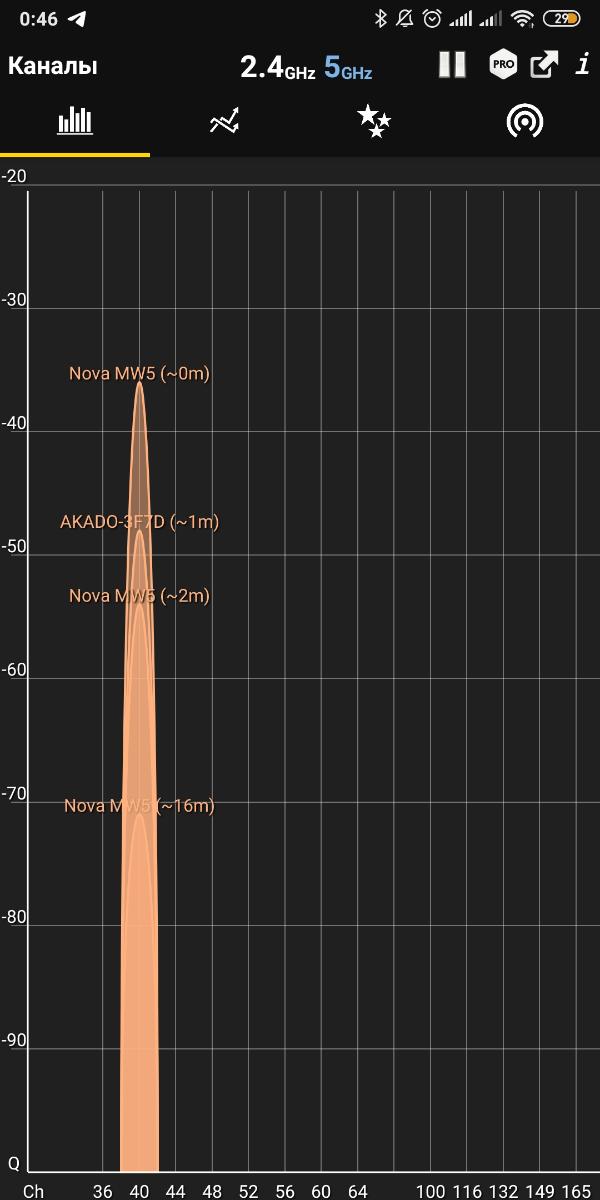 Сразу оговорюсь, что в условиях помещения площадью 70 кв.м. проблемы выявить сложно, т.к. ноды располагаются близко и с легкостью покрывают всю площадь. Приведу примеры на частоте 2,4 и 5 ГГц по очереди.