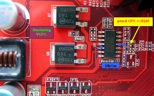 На графическое ядро подаётся напряжение 1.22V (в 3D режиме +0.02V), а на память - 2.08V. За напряжение питания GPU отвечает микросхема RT9259A. Для поднятия напряжения ядра потребуется переменный резистор на 10kОм. Припаиваем переменное сопротивление к ногам 4й и 12й, которые указаны на рисунке, выставив сопротивление резистора на максимум.