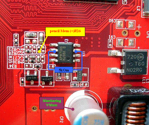 Использование карандашного метода для вольтмода памяти почти исключается, т.к. слишком мал номинал сопротивления необходимого резистора. Но не смотря на это имеется возможность немного повысить напряжение затерев резистор R26, номинал которого - 81Ом.