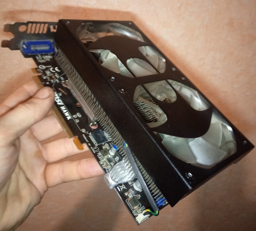 Вентилятор, который имеет больший оборотистый потенциал, я установил на сторону цени питания карты. Подпаял родные тонкие провода от GTX 560 с его 4-пин коннектором. Убрал наклейки, а то ведь СО авторская!