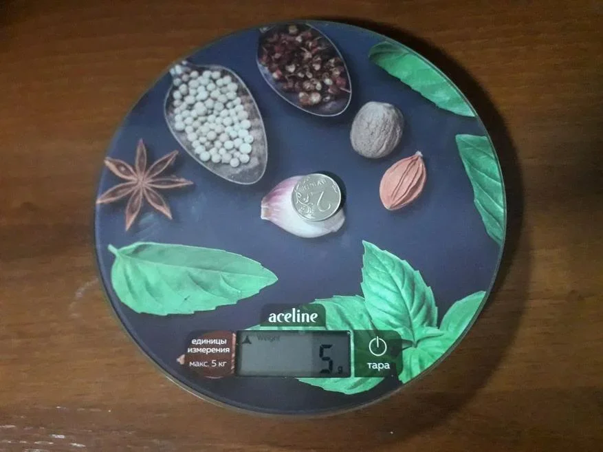 Включить и выключить их легко — удерживаешь кнопку «Тара». Начнём с измерения небольших предметов: