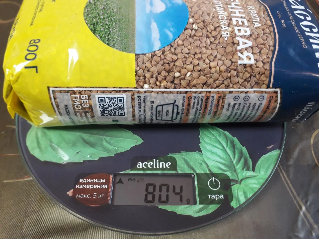 Измерение крупных предметов. Попробовала пачку гречневой крупы. Производитель указал 800 грамм, так что 804 грамма с упаковкой вполне объяснимы.