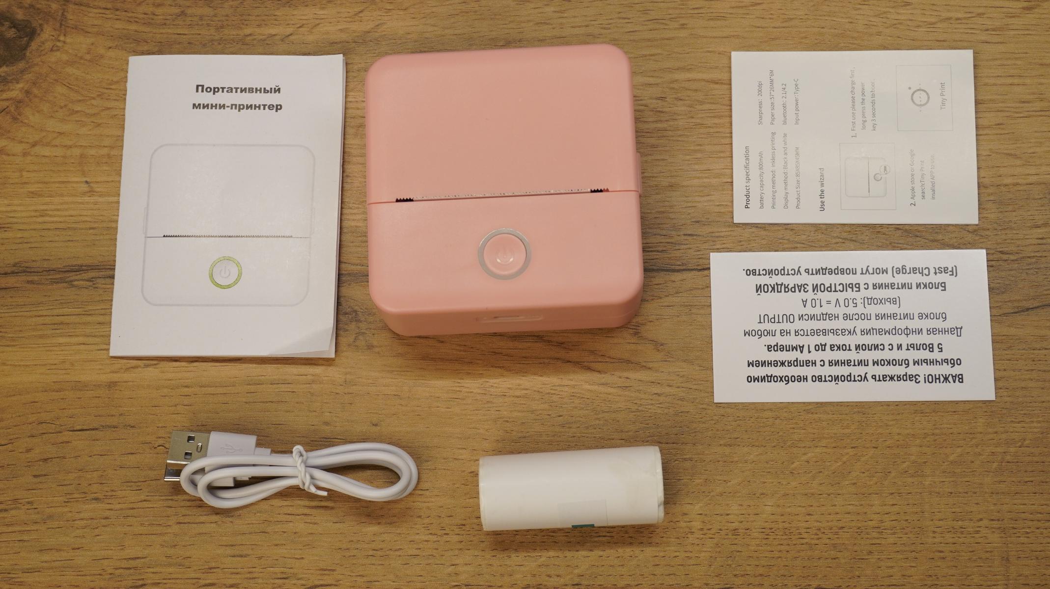 Производитель предусмотрел две инструкции: одна на английском, вторая на русском языке. Внутри самого принтера уже стоит рулон обычной термобумаги, а в коробке вы найдёте ещё один рулон самоклеящейся бумаги. Также прилагается короткий кабель (примерно 40 см) для зарядки.