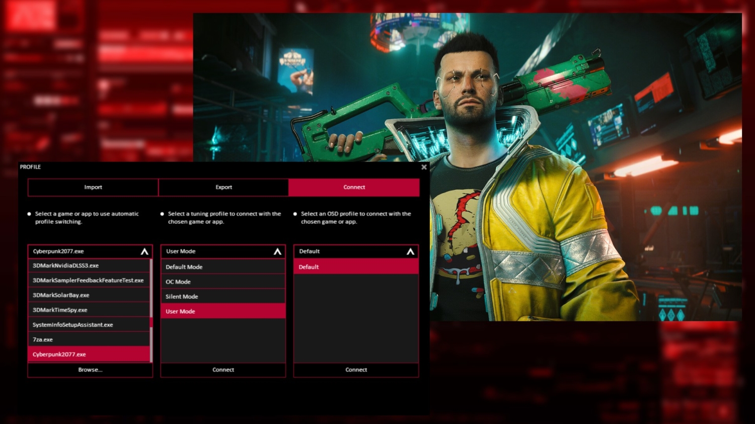 Одной из самых мощных функций GPU Tweak III является опция Connect. Она сканирует ваш компьютер на наличие игр и исполняемых файлов приложений и позволяет вам вручную выбрать профиль разгона, который включится при следующем запуске. Это отличный способ переключаться между режимами разгона для визуально тяжелых игр, таких как Cyberpunk 2077 и Alan Wake II, и более тихими режимами, когда вы не играете или играете в простую игру, такую как Vampire Survivors, которая не требует большого количества ресурсов видеокарты.