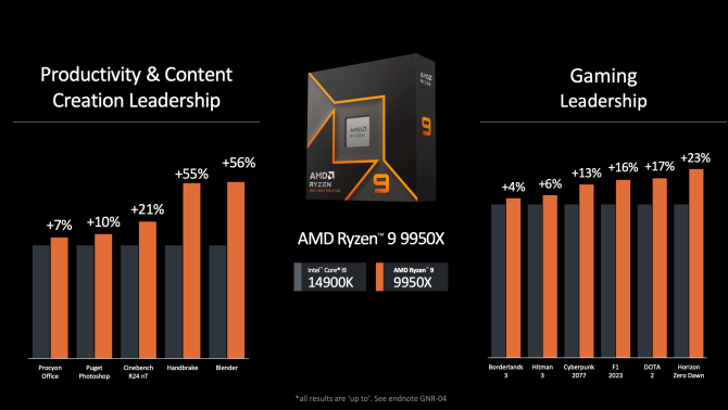 AMD провела сравнительное тестирование только флагманской модели 9950X с процессором Intel Core i9-14900K, утверждая, что он быстрее как в играх, так и в создании контента. Например, его преимущество в играх над процессором Intel варьируется от 4% в Borderlands 3 до 23% в Horizon Zero Dawn. В приложениях для создания контента он мощнее чипа Intel, с разбросом от 7% в Procyon Office до 56% в Blender. AMD также утверждает, что 9950X на 20% быстрее в обучении языковых моделей (LLM) с использованием Mistral в пересчёте на токены в секунду.