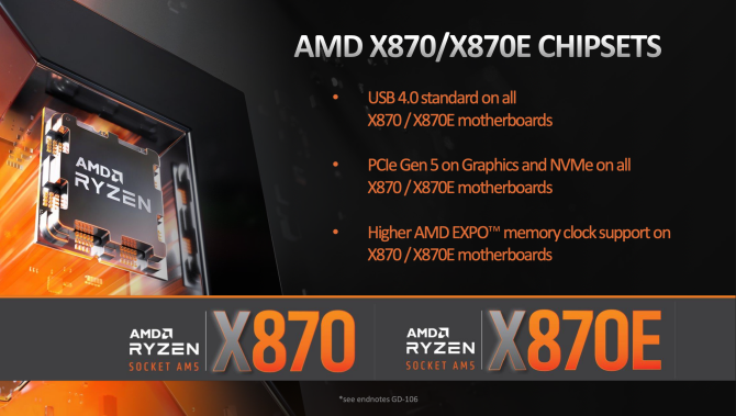 Обеспечить повышенную производительность помогут обновленные чипсеты AMD X870 и X870E (extreme). Новые чипсеты будут иметь много общих функций, включая USB 4, PCIe Gen 5 как для графического процессора, так и для M.2-накопителя, а также более высокие тактовые частоты памяти EXPO, хотя AMD не раскрывает максимальные значения для этой функции.