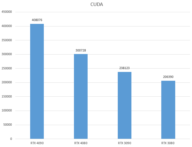 Начнем с CUDA , который является эксклюзивным для графических процессоров NVIDIA, здесь RTX 4080 набрала 300728 баллов. Это отличный результат, который показал улучшение производительности на 45% по сравнению с RTX 3080. Тесты показали, что 4080 занимает заслуженное второе место, потому что единственным реальным конкурентом здесь является RTX 4090.
