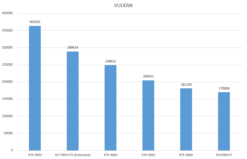 Переходим к тесту VULKAN, здесь RTX 4080 набрала 289014 баллов. Судя по этому графику, недавно анонсированная RX 7900 XTX будет в 1,7 раза быстрее, чем 6900XT. Возможно, это не окончательный результат, но опубликованный тест даёт нам приблизительное представление о том, как работает архитектура RDNA3. Но самое интересно, что здесь RTX 4080 проигрывает 7900XTX, несмотря на то, что она дороже.